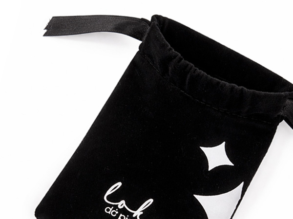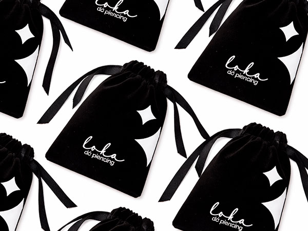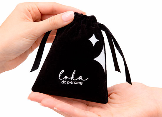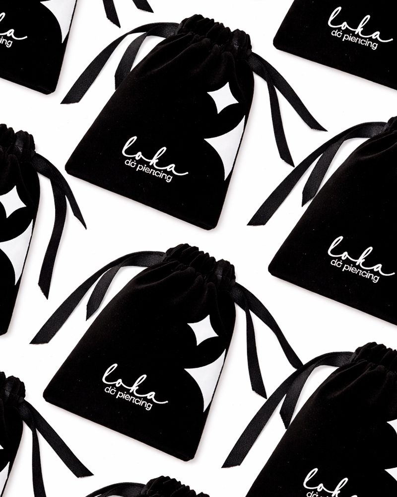 A Embalagem de Presente da Loka do Piercing é um saquinho de joia confeccionado em camurça, personalizado com a marca, pensado para envolver a joia com elegância, cuidado e presença.