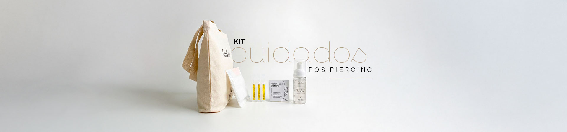 CONTEÚDO: 1 frasco pump 50ml (sem produto), 1 pacote com 5 unidades de gaze estéril, 3 ampolas de cloreto de sódio 0,9% (10ml cada), 1 protetor de piercing com 2 unidades e 1 mini ecobag exclusiva