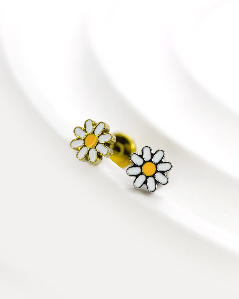 Piercing confeccionado em titânio ASTM F-136, com design de margarida, esmaltada. É um labret com forma de abertura por rosca interna. Uma joia delicada & minimalista, utilizada em perfurações auriculares como tragus, conch, scapha, helix e lóbulo, mas também em perfurações bucais como medusa, ou até mesmo aba nasal. Lembrando que você pode escolher a cor da sua joia através da anodização.