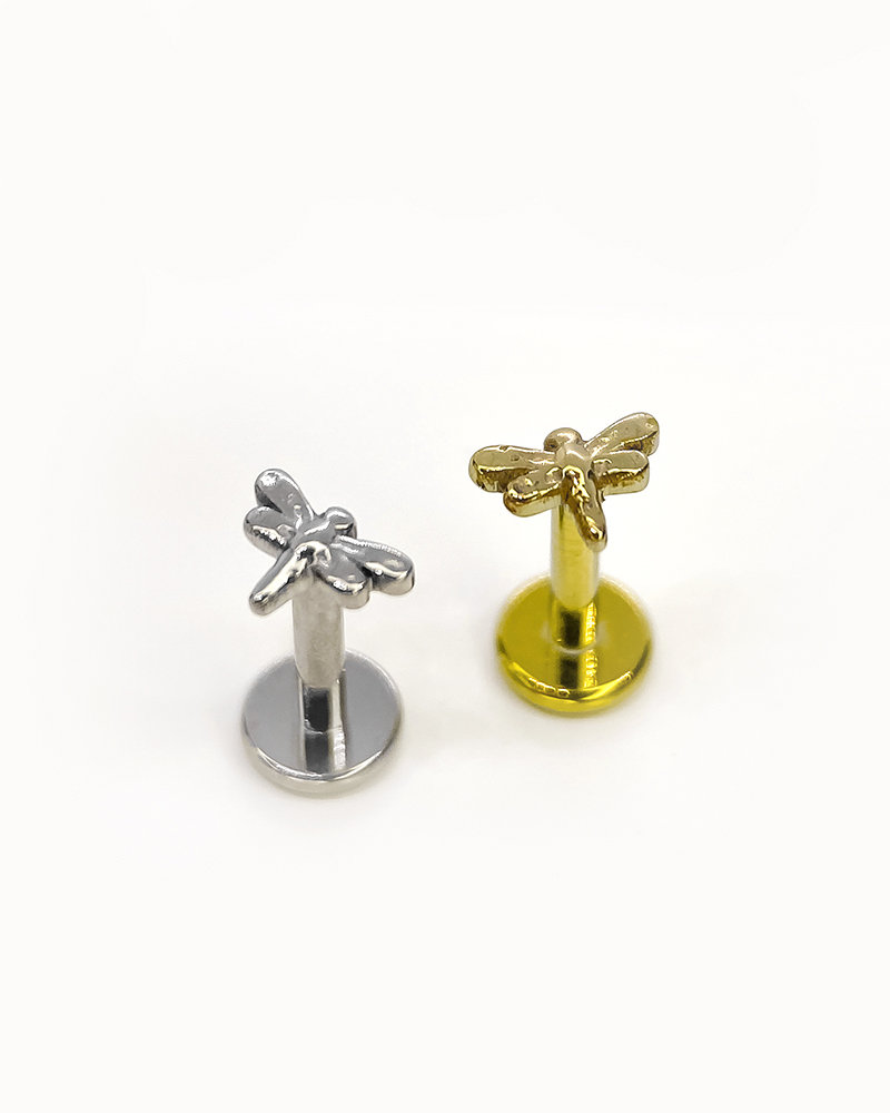 Piercing confeccionado em titânio ASTM F-136, com design de libélula. É um labret com forma de abertura por rosca interna. Uma joia delicada e minimalista, utilizada principalmente em perfurações auriculares como tragus, conch, scapha, helix e lóbulo. Lembrando que você pode escolher a cor da sua joia através da anodização.
