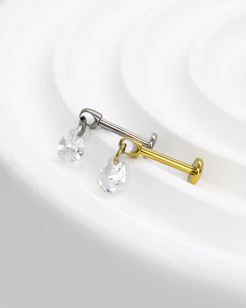 Piercing confeccionado em titânio ASTM F-136, com zircônia de gota pendente. É um labret com forma de abertura por rosca interna. Uma delicadeza, para quem busca uma joia diferenciada e com brilho. Pode ser utilizado em perfurações auriculares como tragus, conch, scapha, helix, flat, conchrim e lóbulo. Lembrando que você pode escolher a cor da joia através da anodização.
