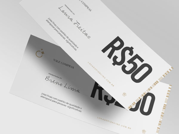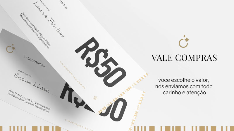 O Vale Compras – Virtual permite que a pessoa presenteada utilize o valor em compras na loja online da Loka do Piercing, escolhendo as joias no momento certo e com total liberdade.